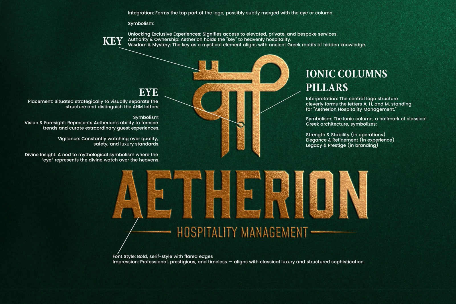 Designed a classical luxury-inspired logo for Aetherion Hospitality Management, integrating mythological symbolism, architectural structure, and premium typography to reflect prestige, authority, and elevated hospitality experiences.